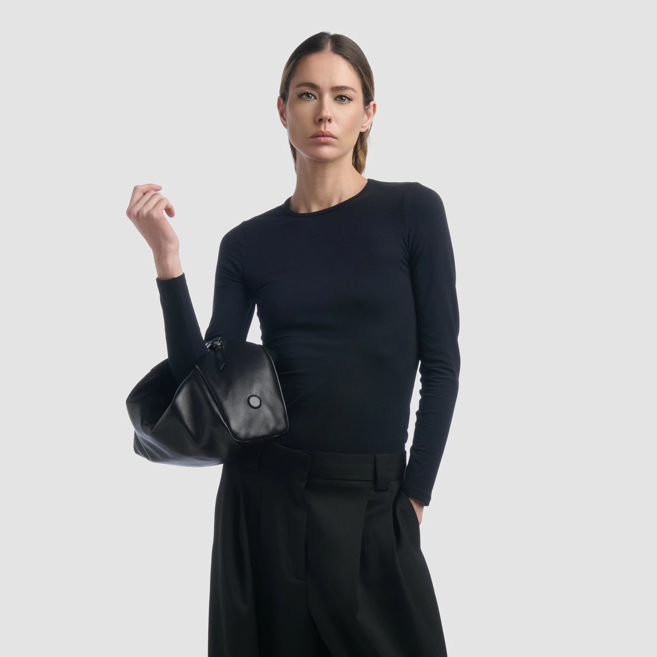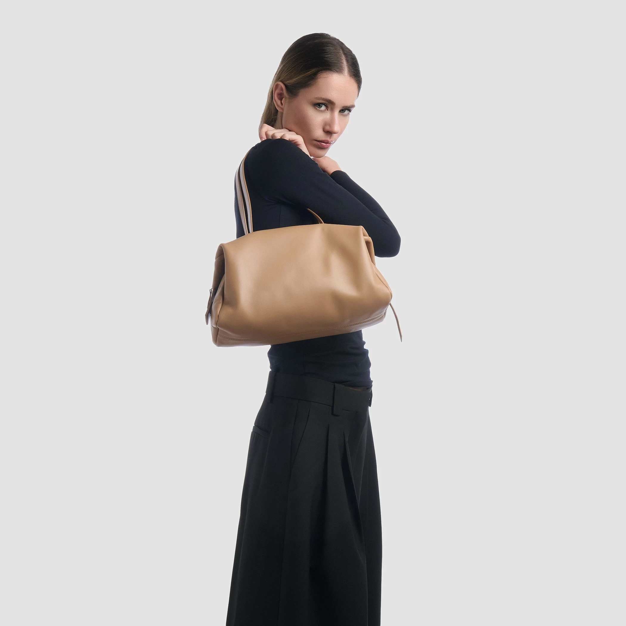 Borsa a spalla media con maniglie a doppia vestibilità, in morbida nappa.