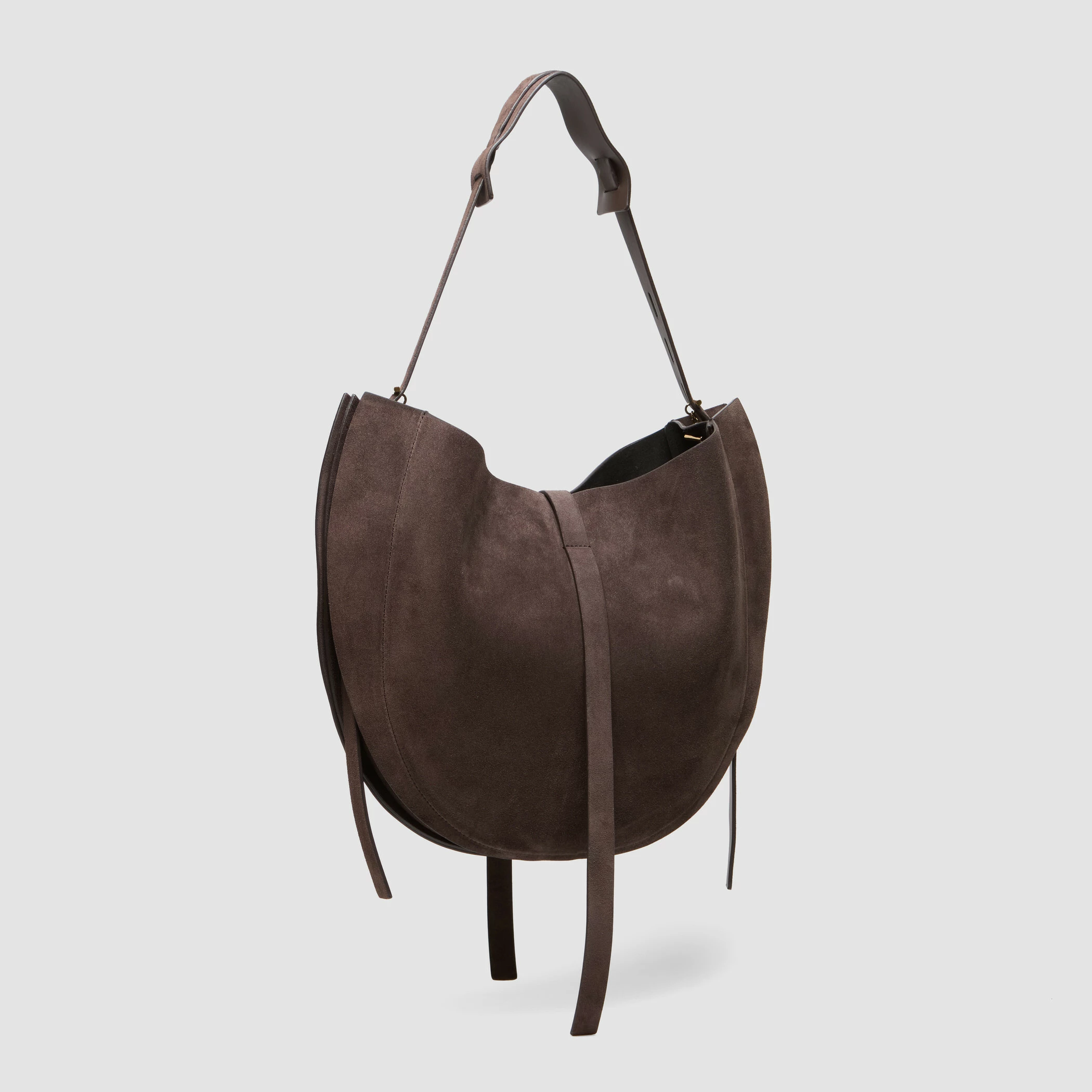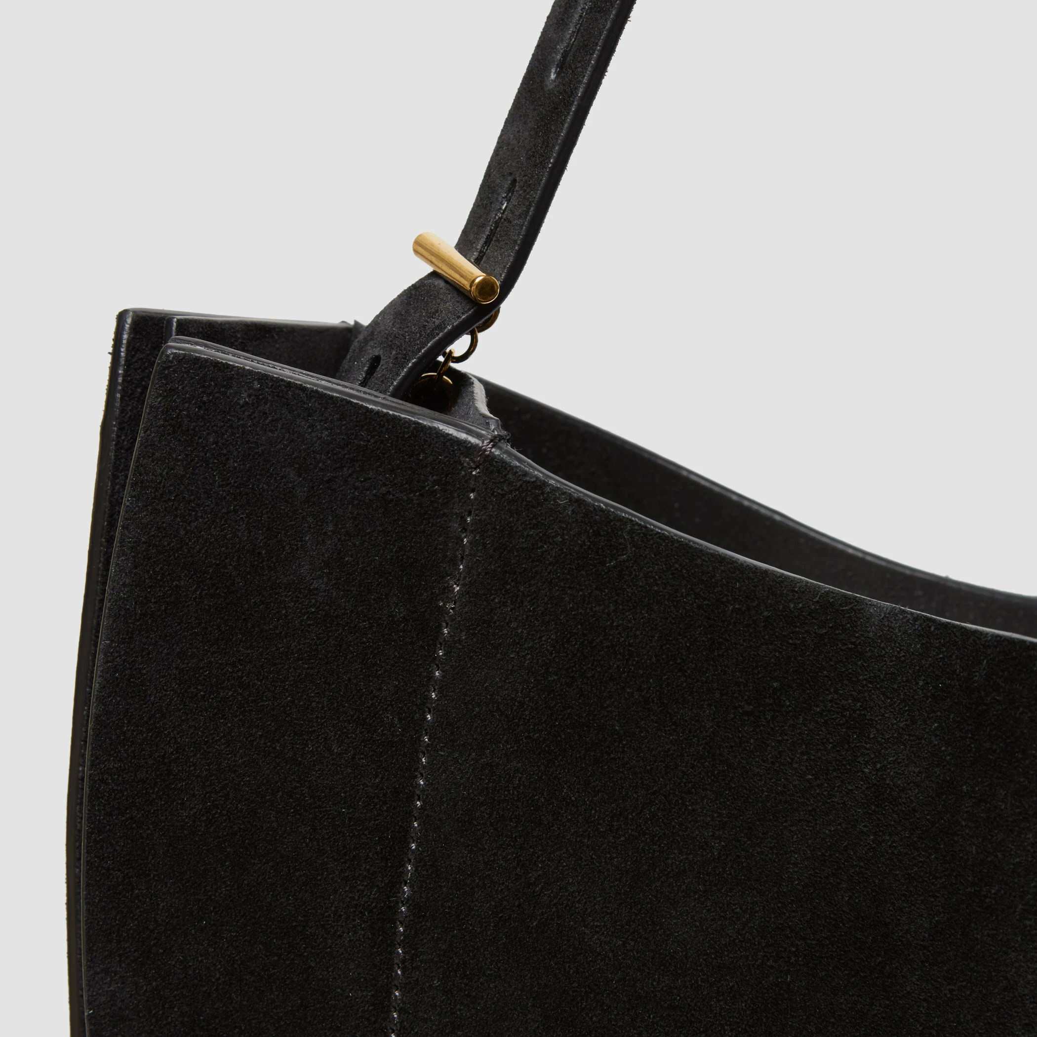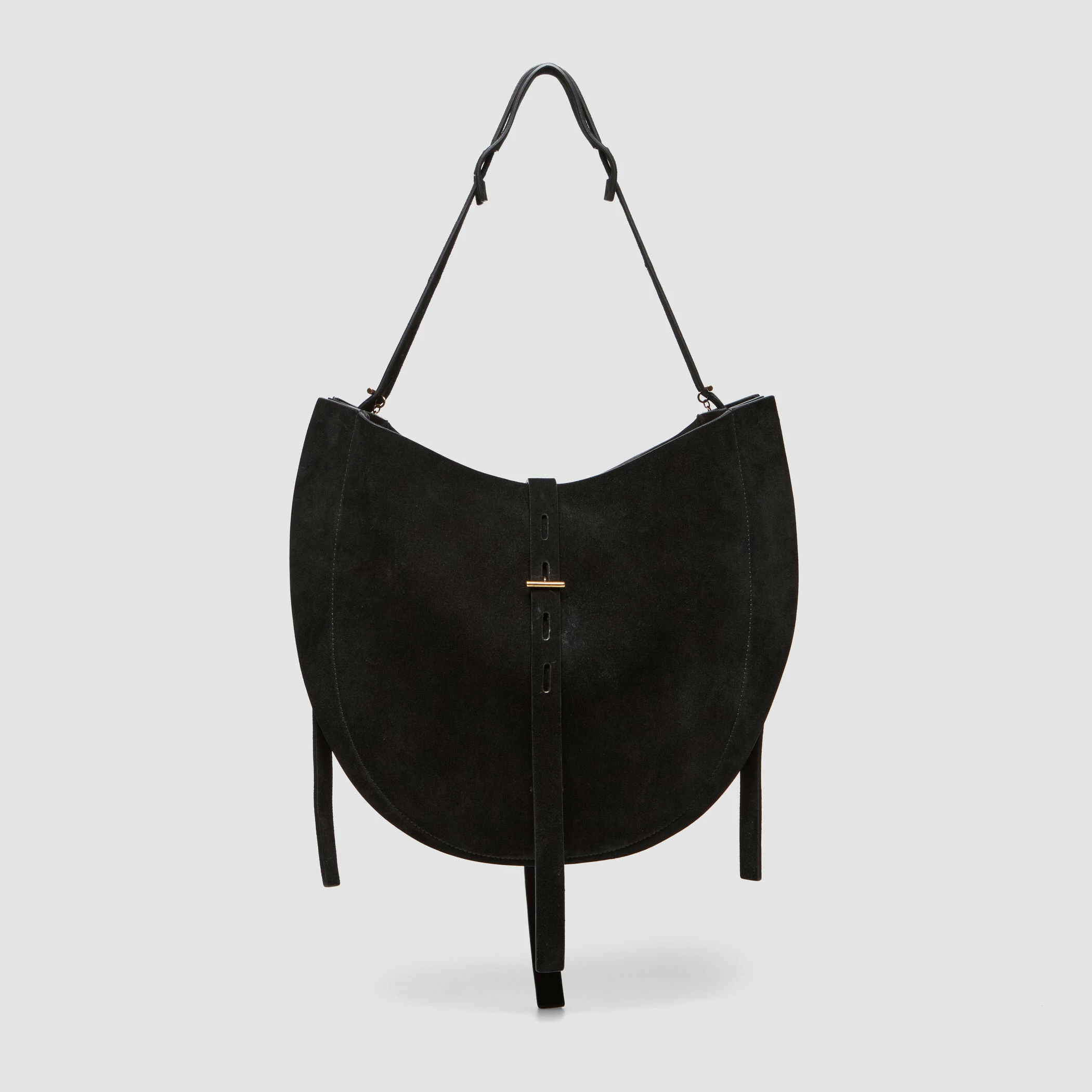 Borsa Hobo in suede con tracolla regolabile. Dotata di tasca interna con chiusura a zip, finiture metalliche in oro nero e fodera in tessuto nero.