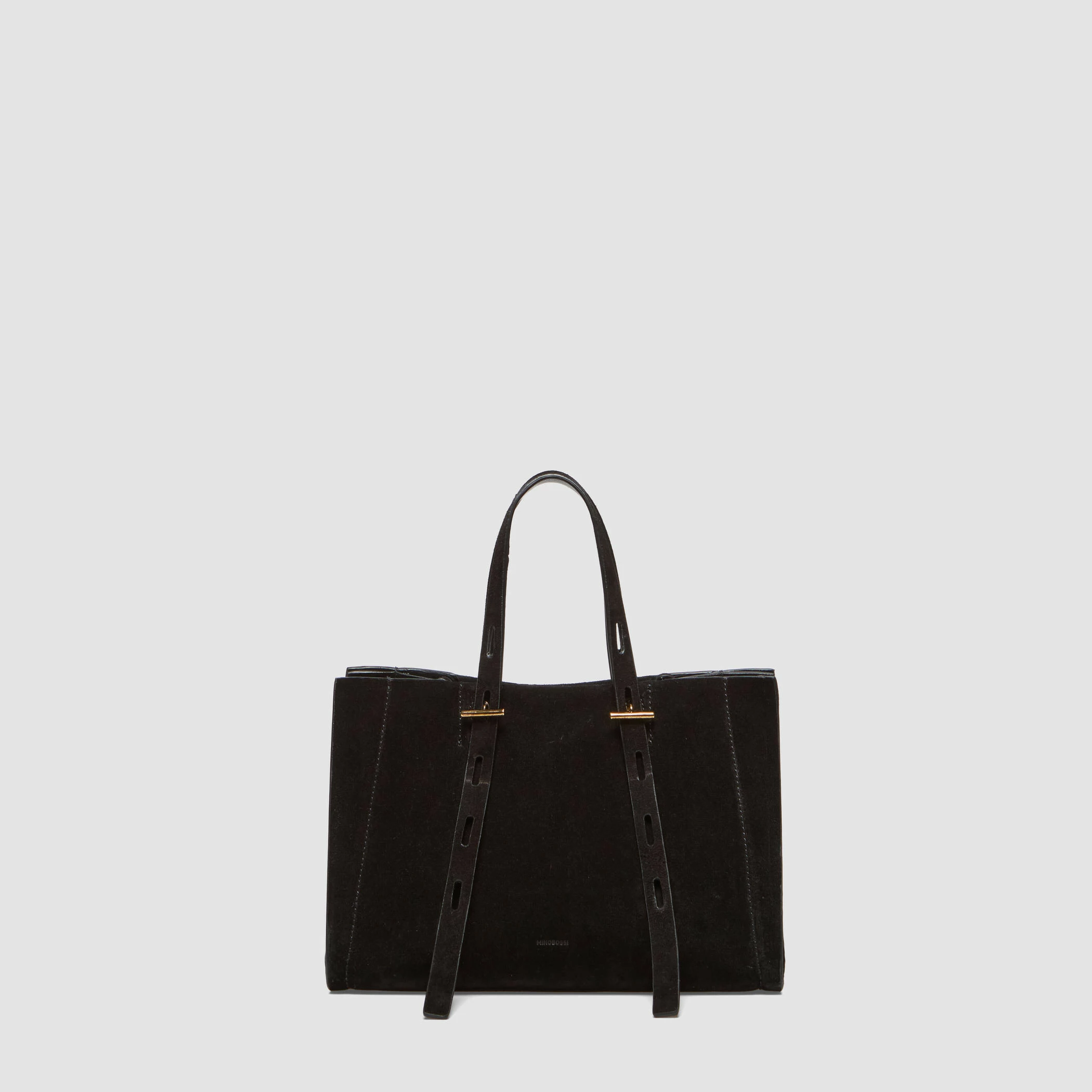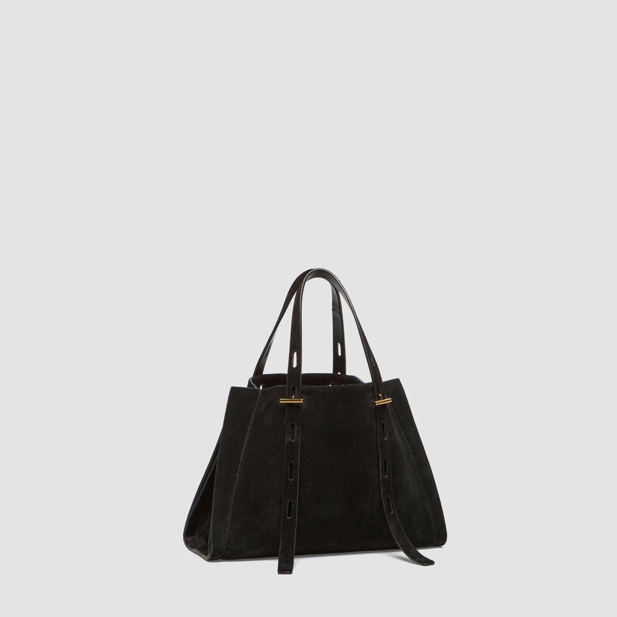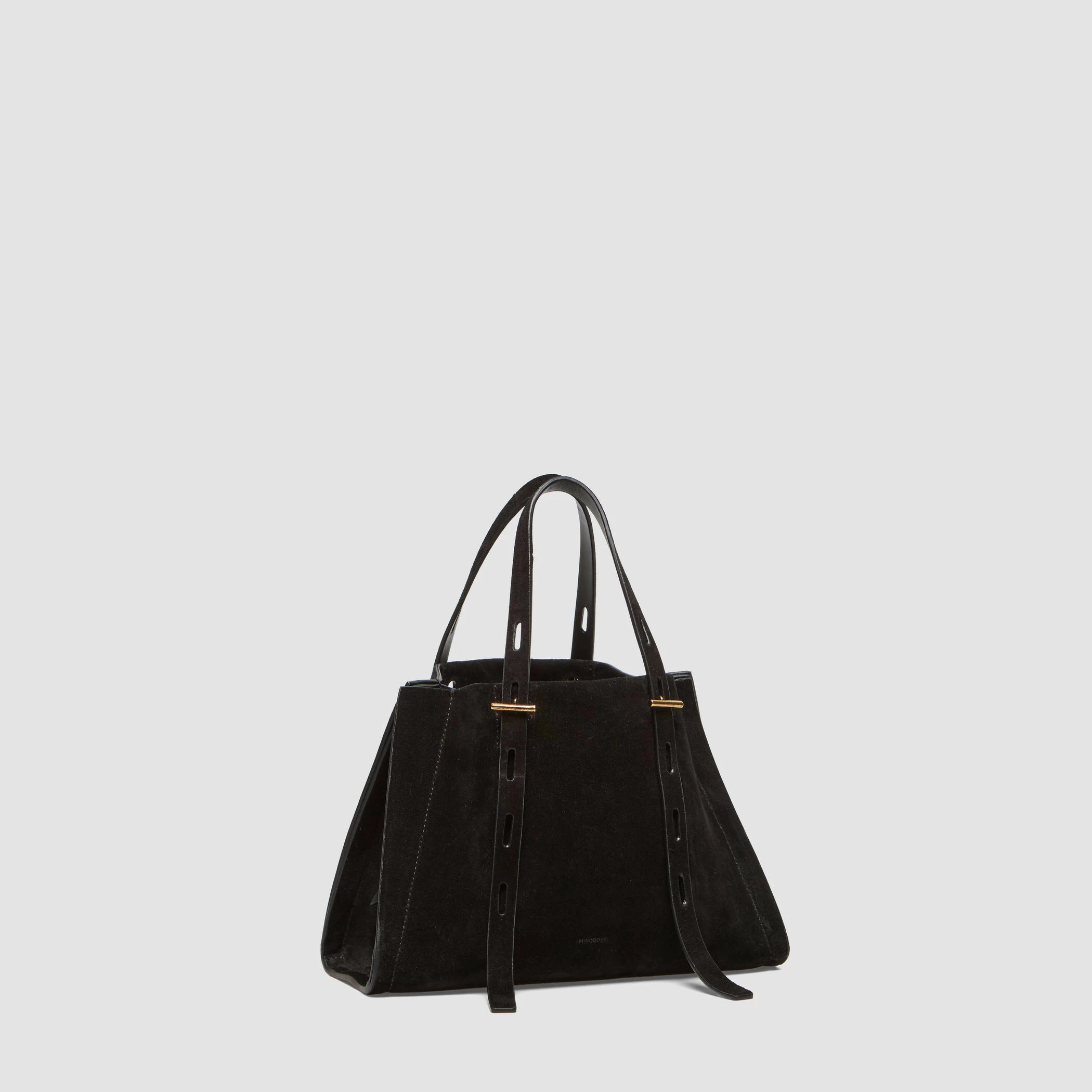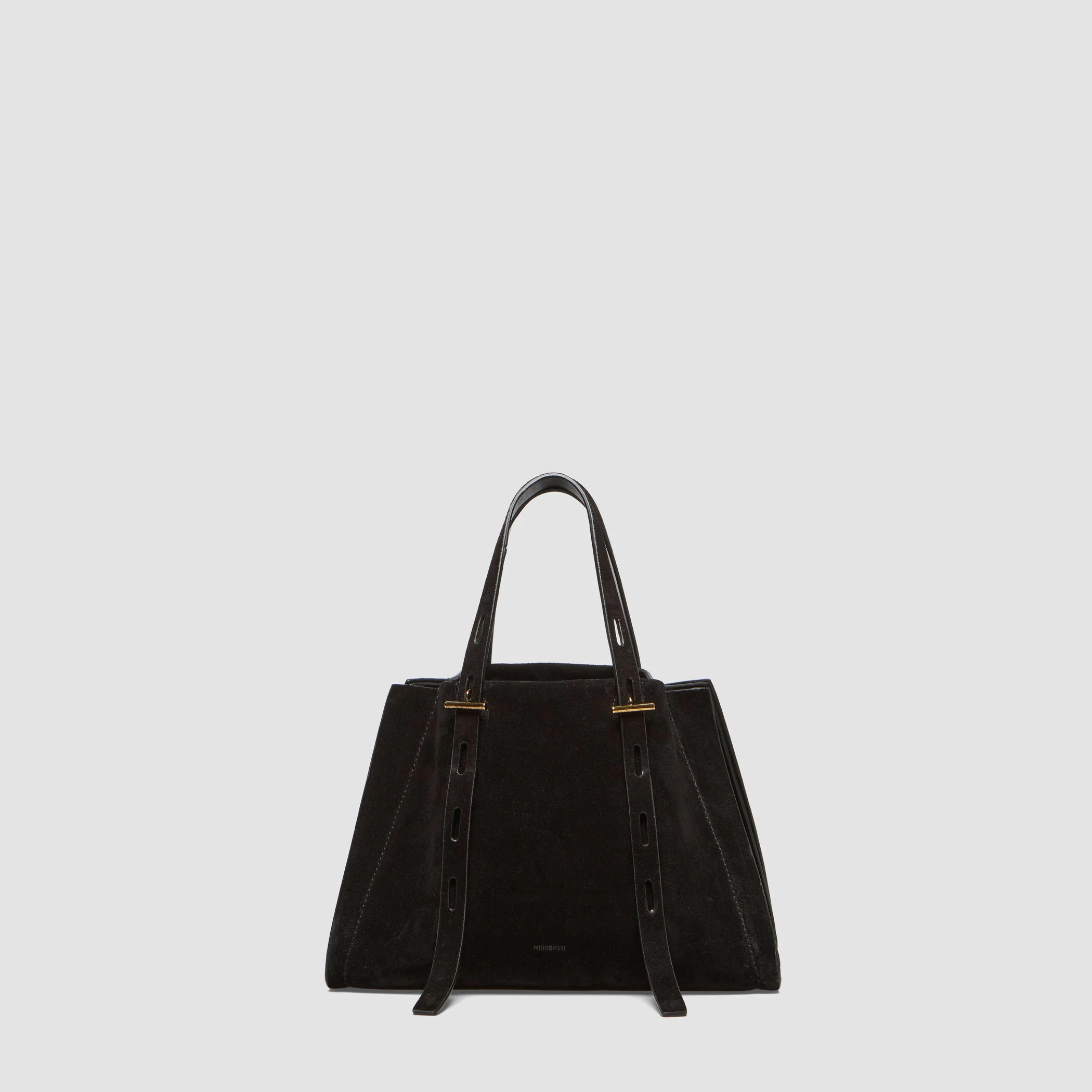 Borsa piccola in suede con maniglia regolabile. Caratterizzata da finiture metalliche in oro nero e fodera interna in tessuto nero.