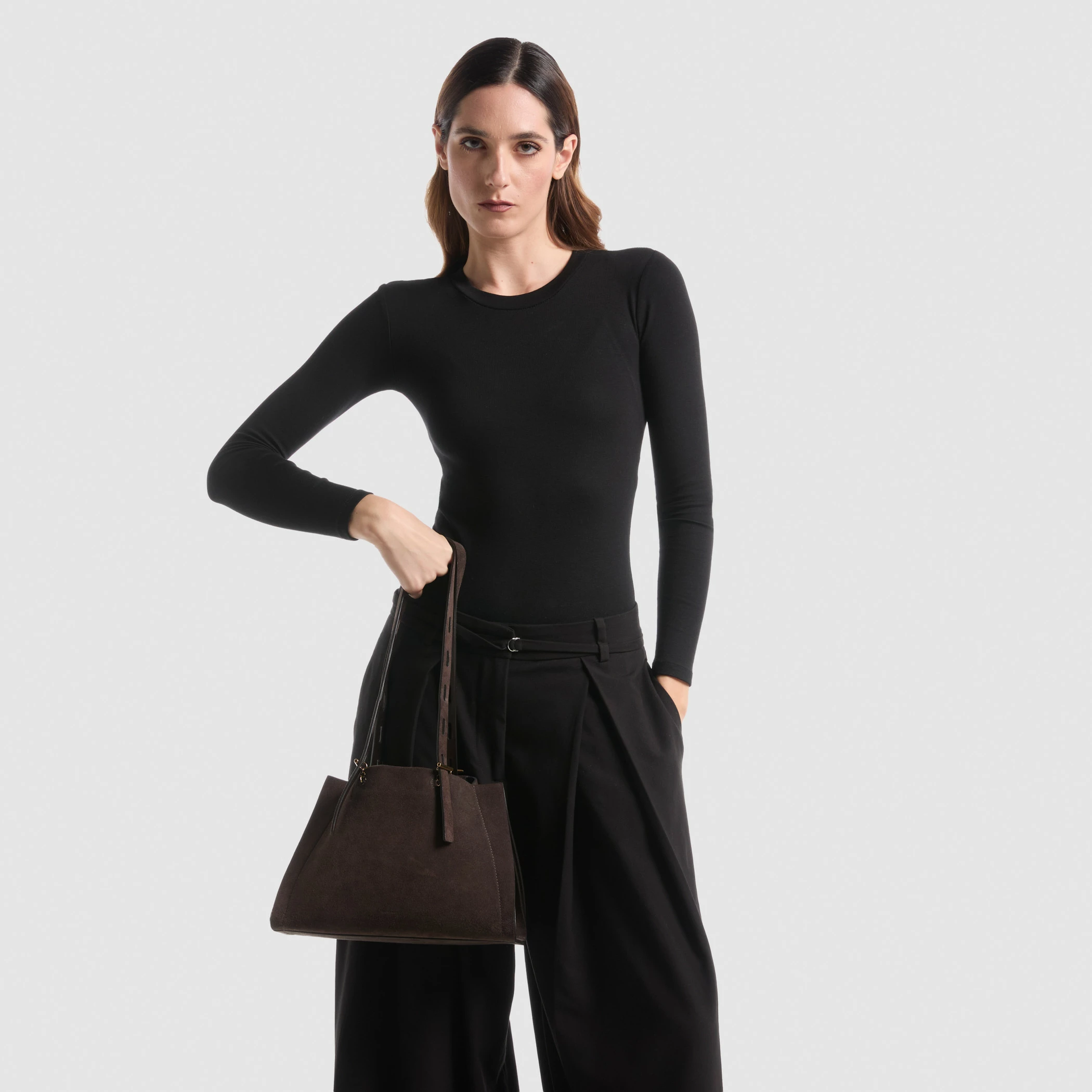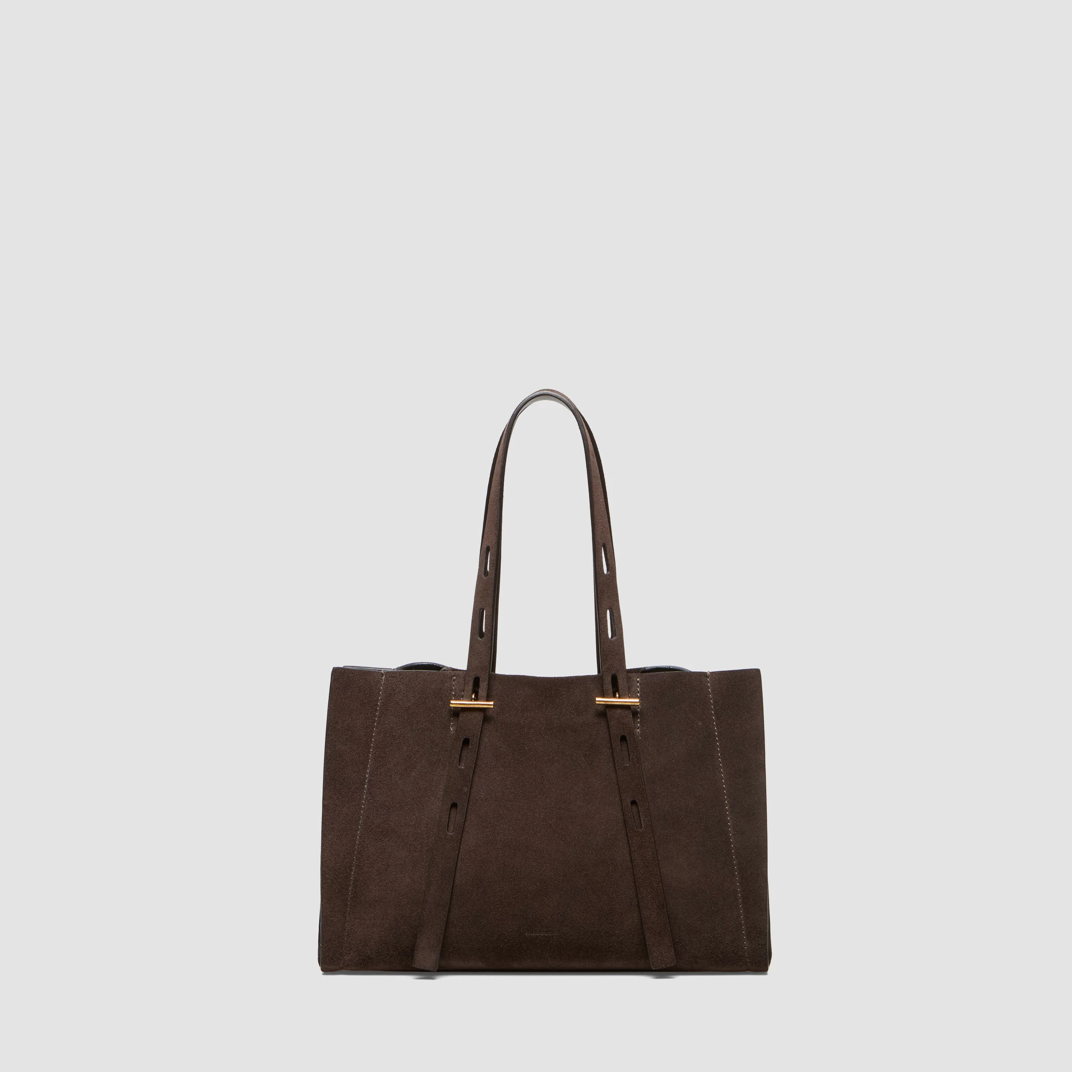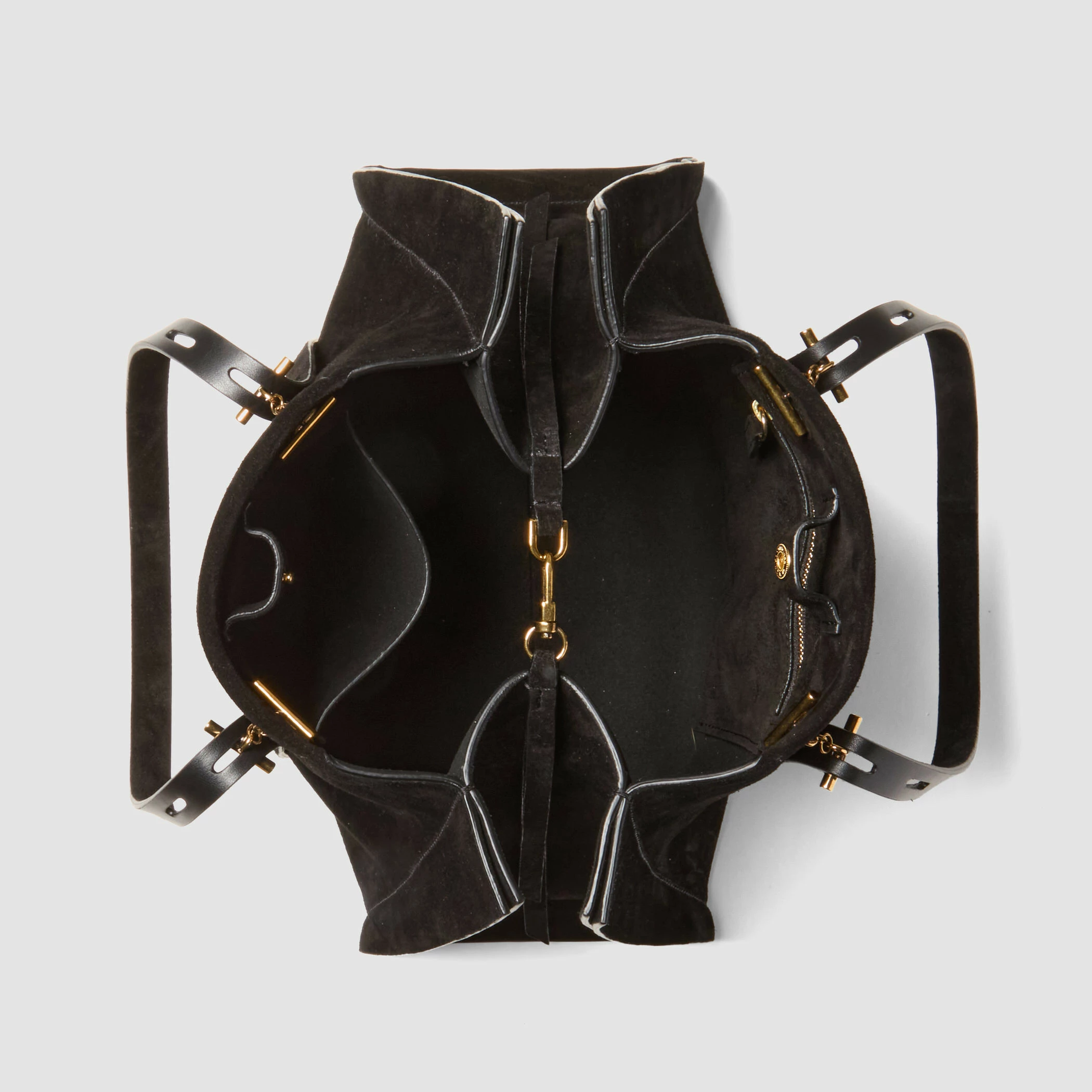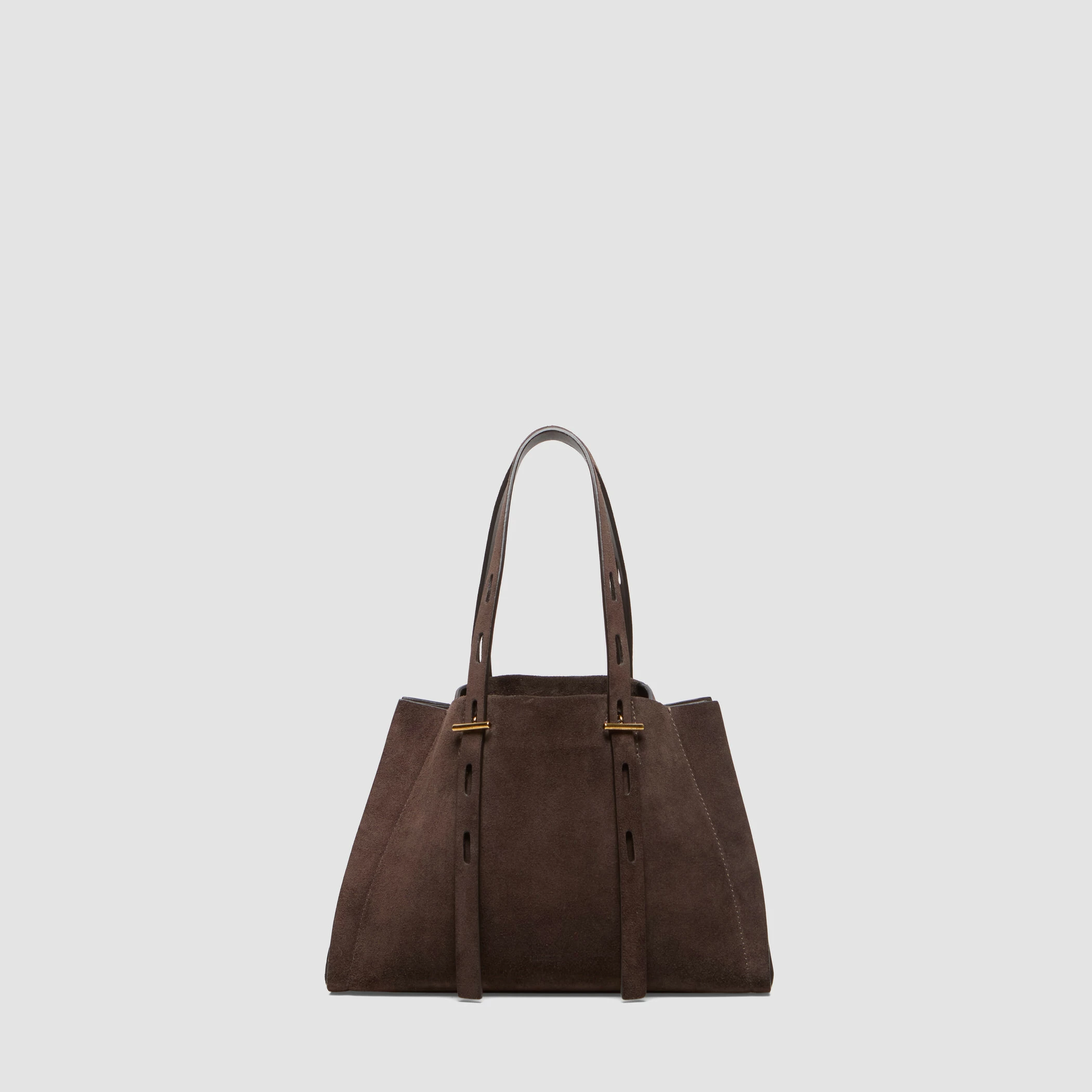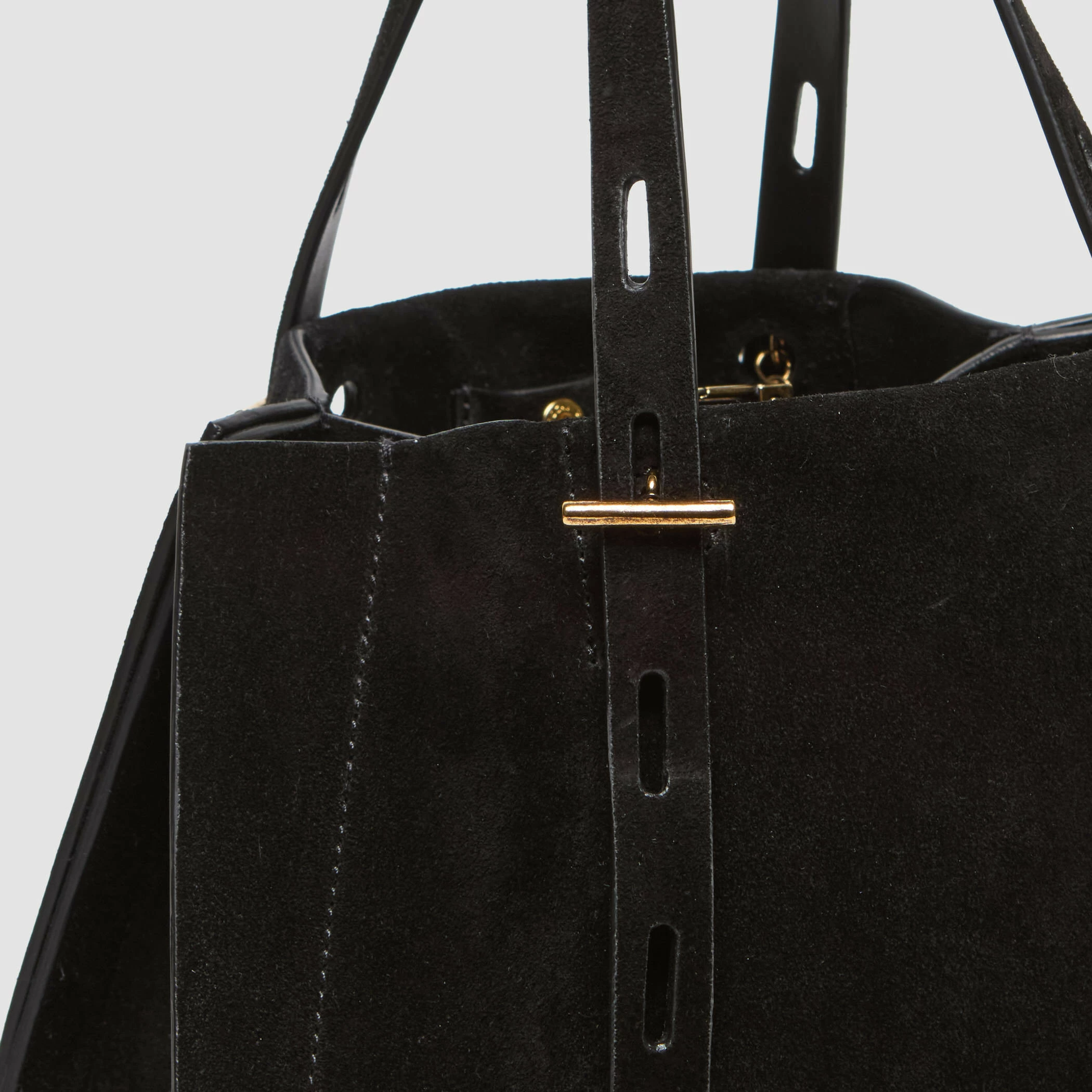 Borsa piccola in suede con maniglia regolabile. Caratterizzata da finiture metalliche in oro nero e fodera interna in tessuto nero.